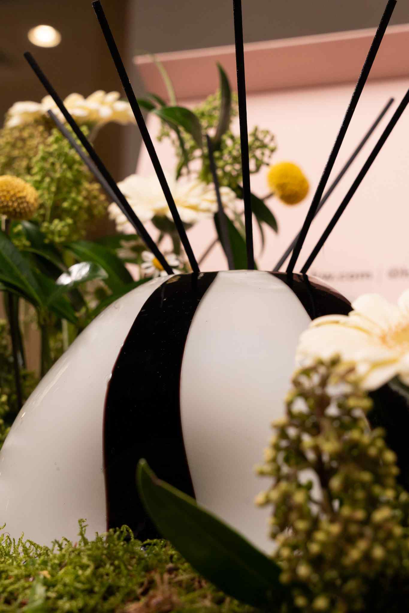 A medium diffuser glass in Black & White + 10 Difusser Sticks + 2L Bottles of Diffuser Refill in a timemeless composition of luminous citrus, refined bergamot, Egyptian jasmine, and velvety muskwith a white and yellow floral arrangement