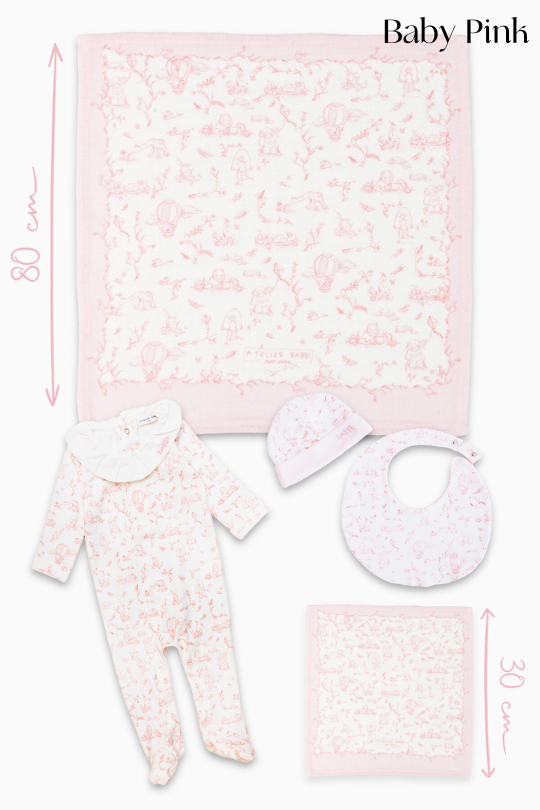 New Born Gift includes; Jumpsuit, Bib, Hat, Blanket and Mouth Cloth with a white arragement of flowers including roses and gerbera