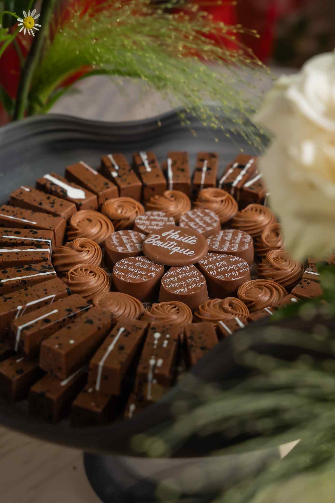 112 Pcs of Creme + Milk Swirl + Coconut | 2 Layers | 0.755 kg including a white floral arrangement