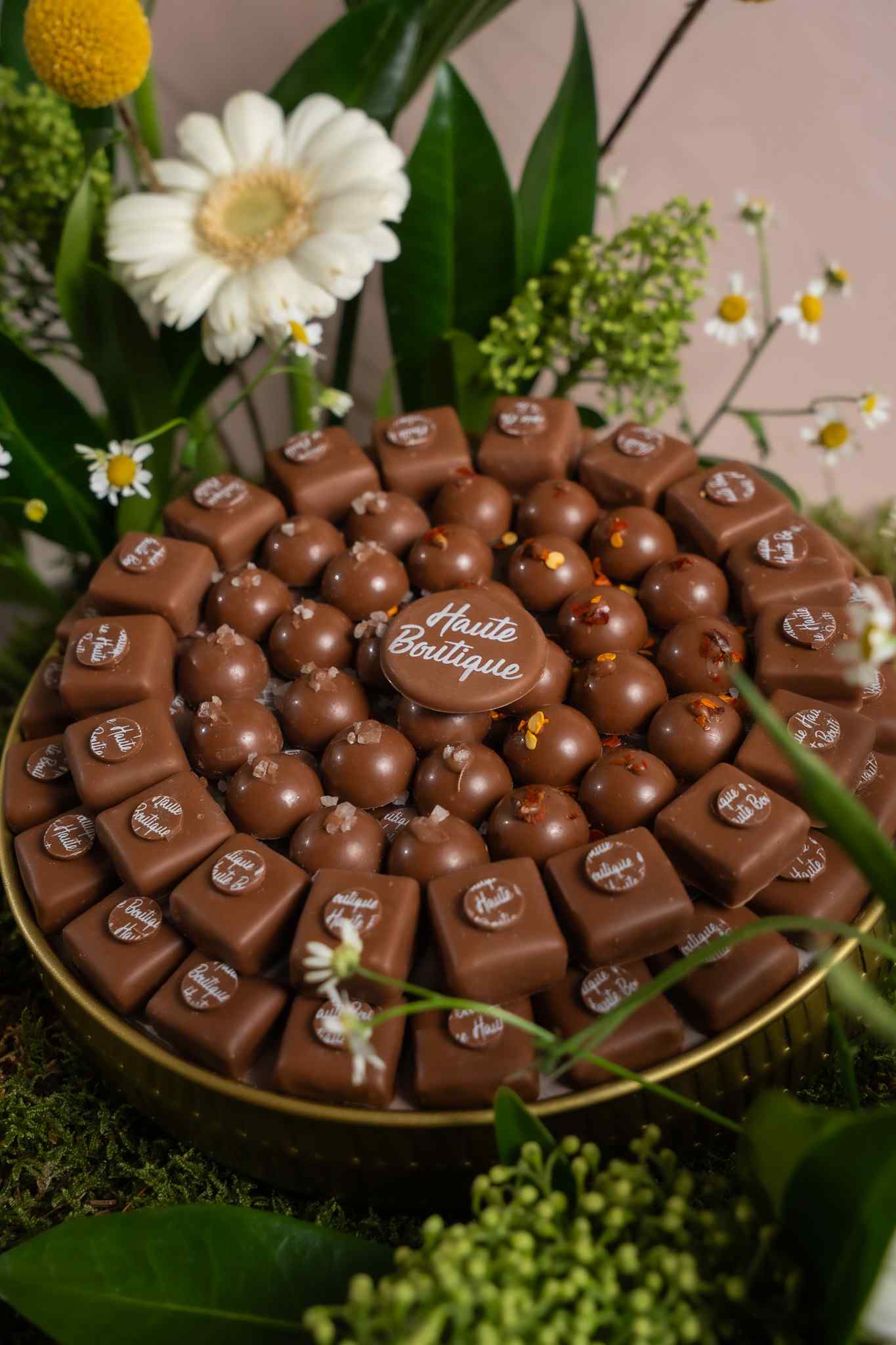 113 Pcs of Haute Fudge + Mini Mix | 2 Layers | 0.415 kg including a white and yellow floral arrangement
