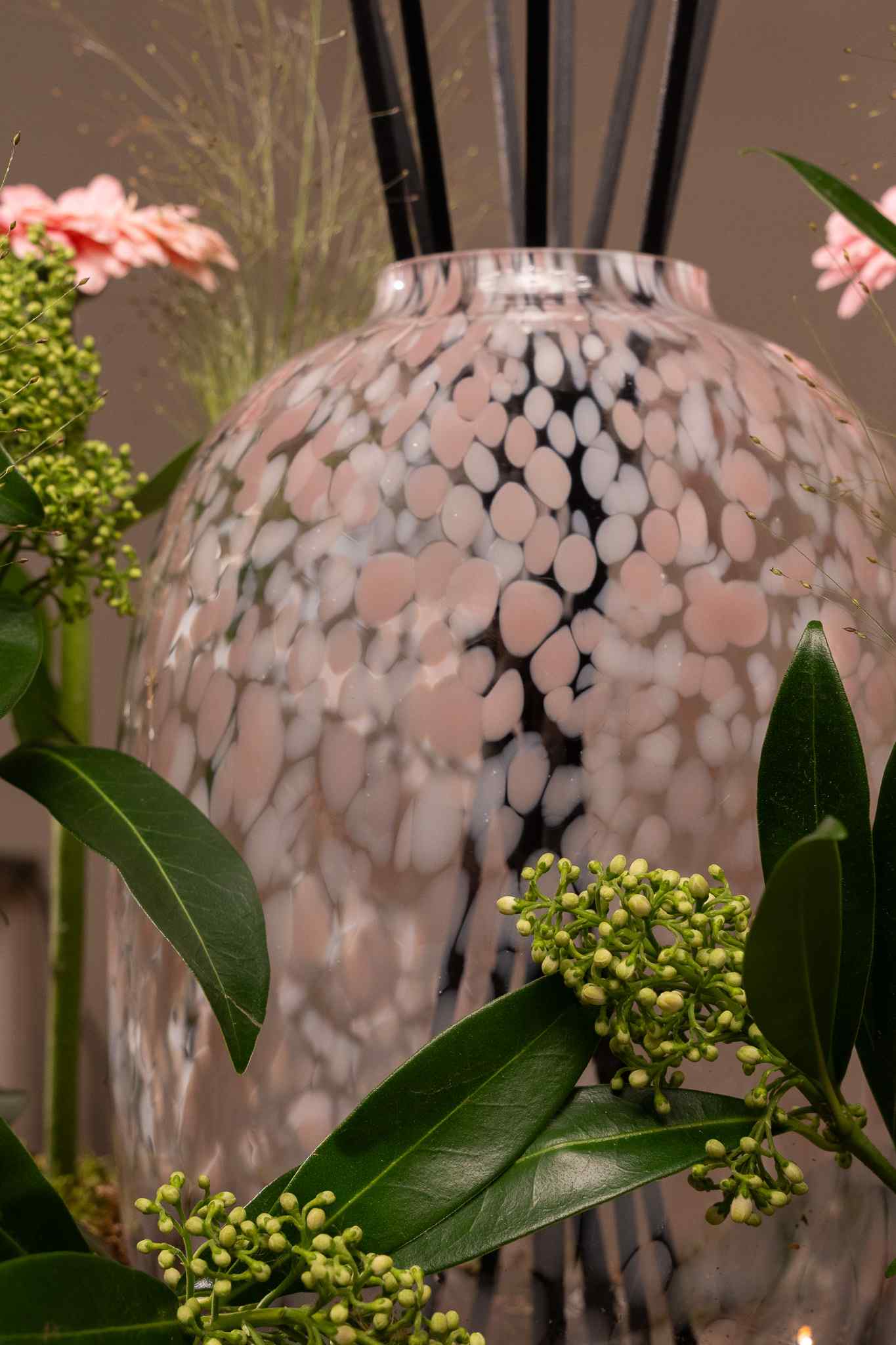 A large diffuser glass in Pink + 10 Large Difusser Sticks + 3L Bottles of Diffuser Refill in a timeless composition of luminous citrus, refined bergamot, Egyptian jasmine, and velvety musk with a pink floral arrangement