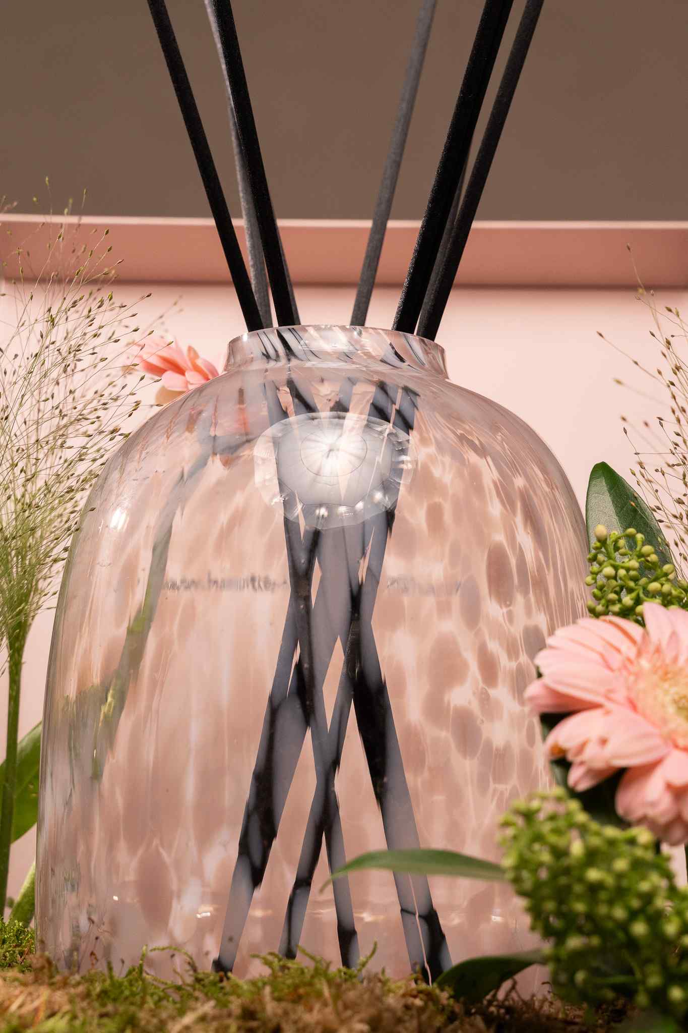 A medium diffuser glass in Pink + 10 Large Difusser Sticks + 2L Bottles of Diffuser Refill in a timeless composition of luminous citrus, refined bergamot, Egyptian jasmine, and velvety musk with a pink floral arrangement