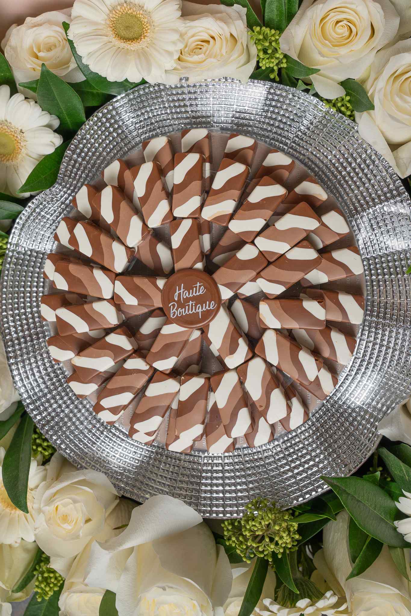 56 Pcs of Salted Pecan | 2 Layers | 0.470 kg including a white floral arrangement