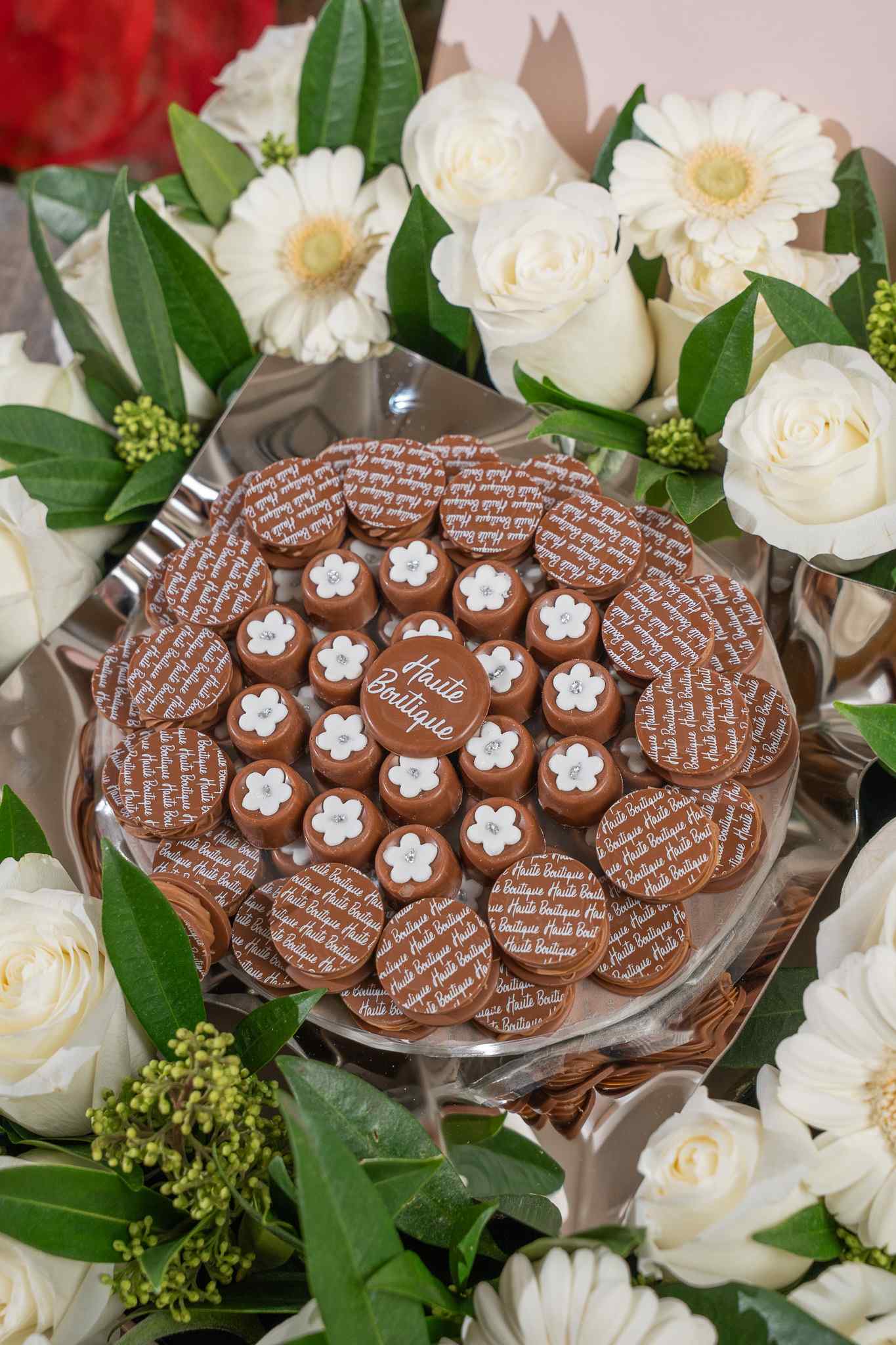 ٧٤ حبة من موكا + رويال | صفين | ٠.٣٦٥ كغم مع تنسيق من الورد باللون الأبيض
