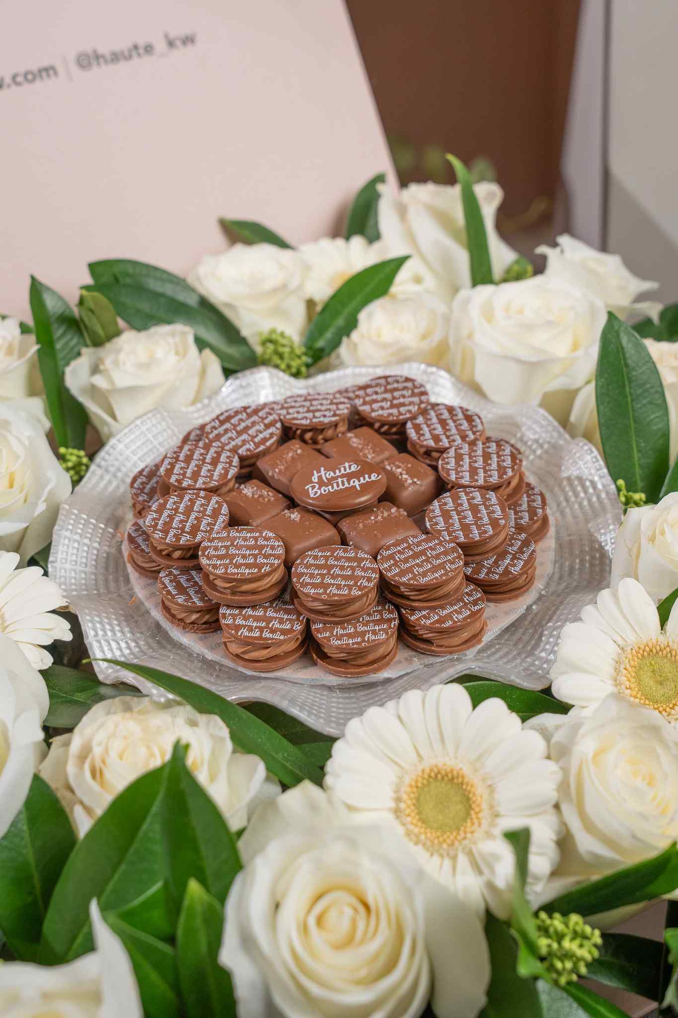٤٠ حبة من موكا + جيوي كاراميل | صفين | ٠.٢٧٥ كغم مع تنسيق من الورد باللون الأبيض