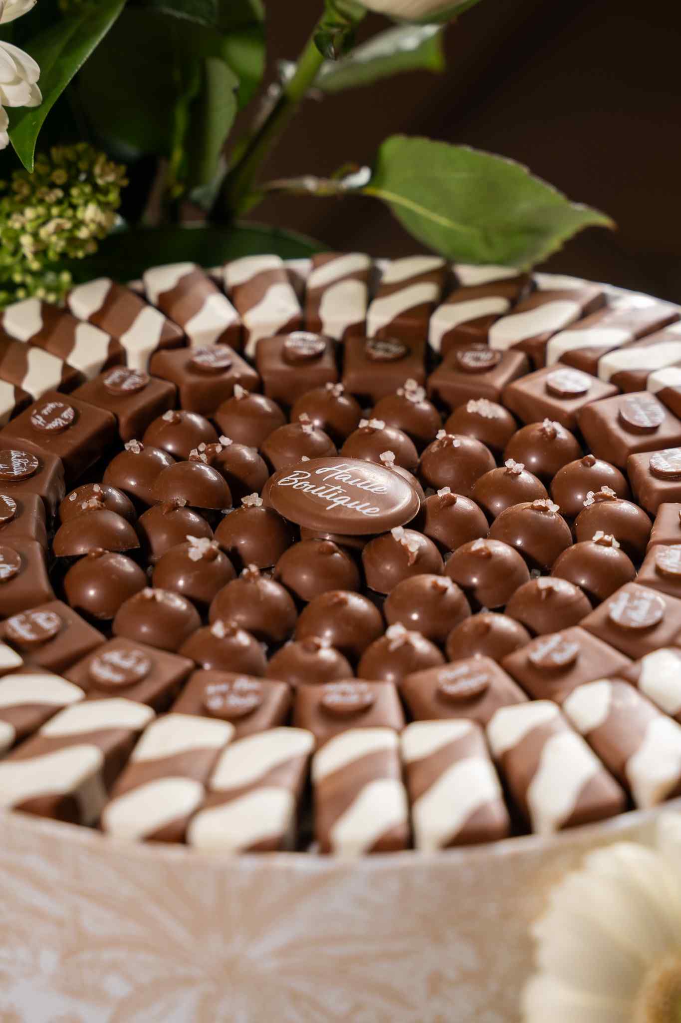 193 Pcs of Salted Pecan + Haute Fudge + Mini Salted Caramel | 2 Layers | 1.025 kg including a white floral arrangement