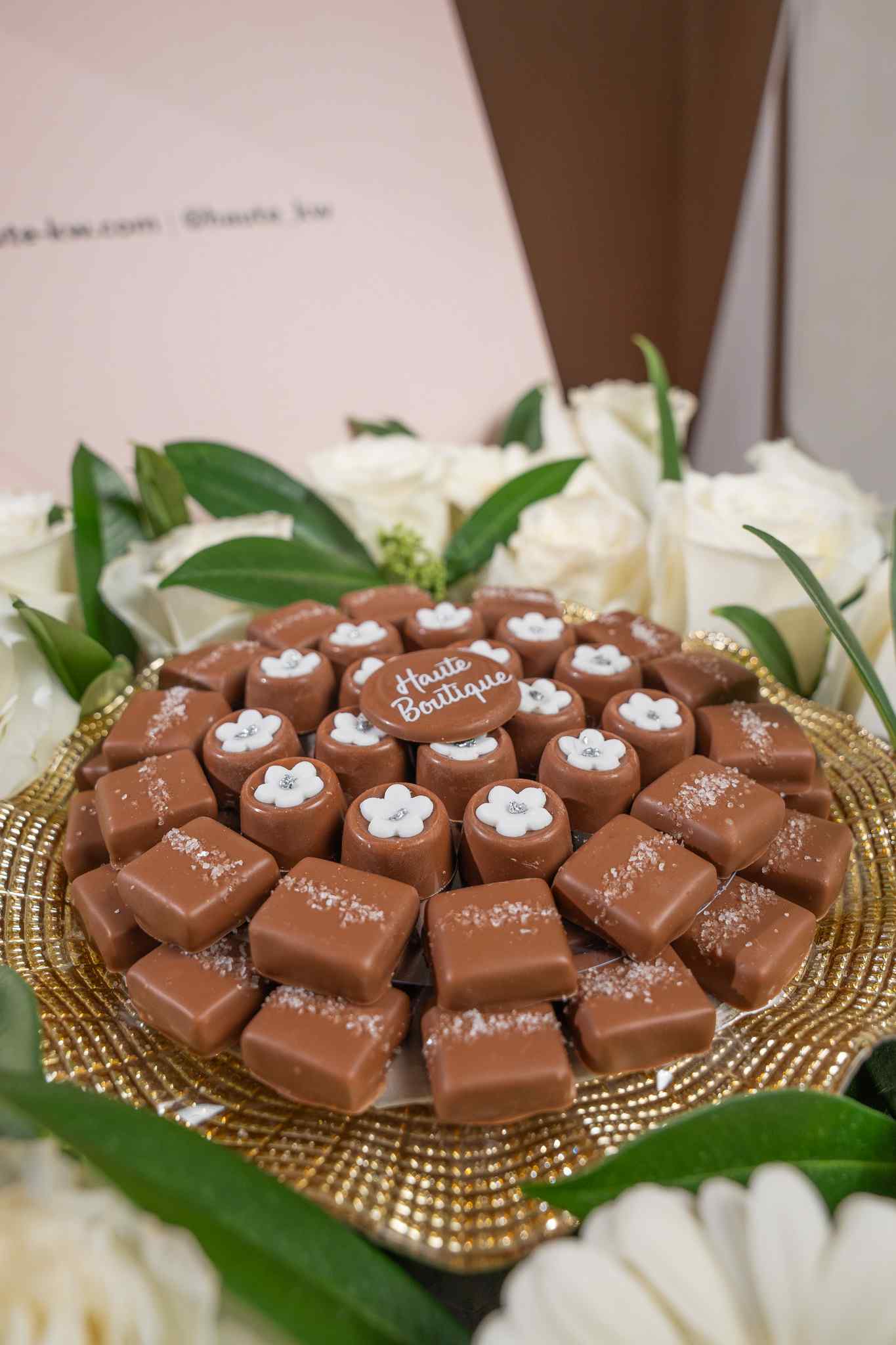 65 Pcs of Chewy Caramel + Royal | 2 Layers | 0.365 kg including a white floral arrangement