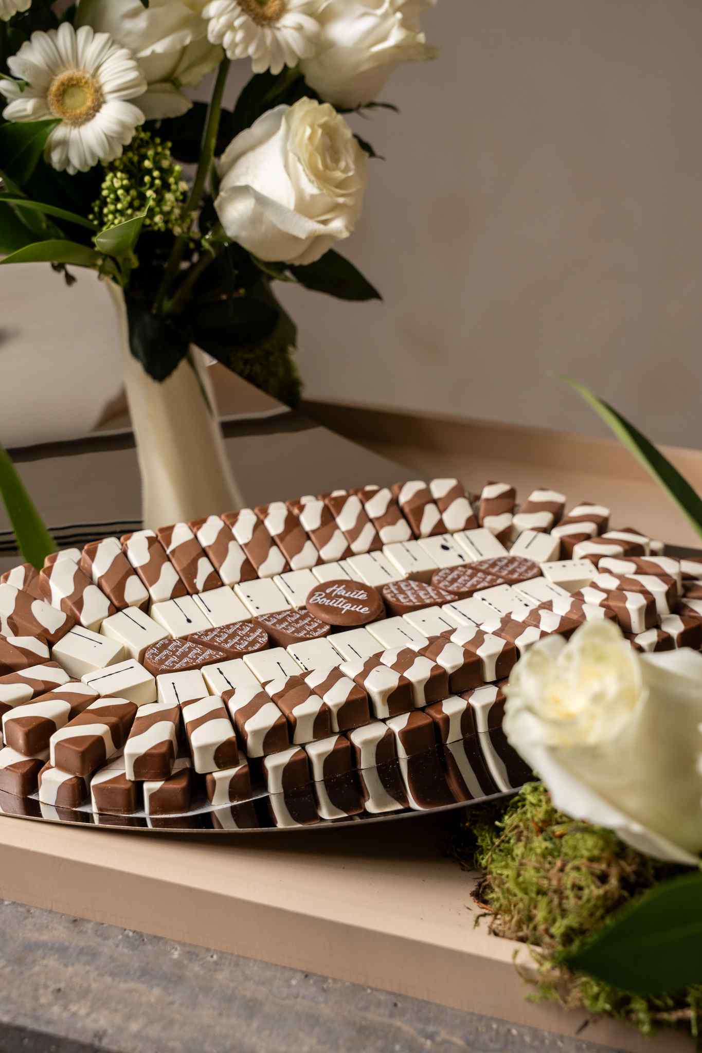 152 Pcs of Salted Pecan + Mystique + Coconut | 2 Layers | 1.110 kg including a white floral arrangement